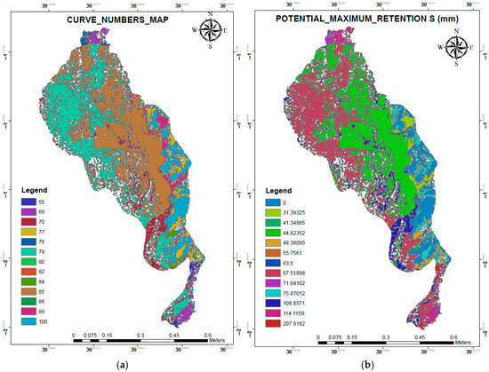 Study area characteristics: (a) curve numbers, (b) potential maximum retention.