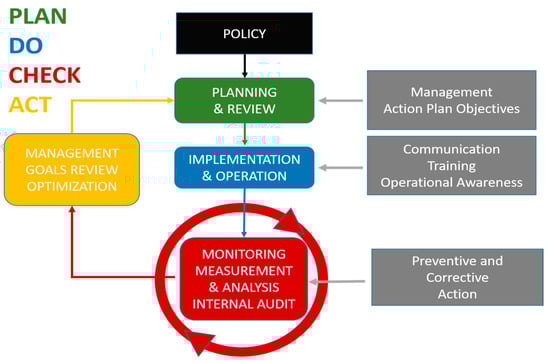 Although also not specifically designed for WWTPs or the water sector in general, the International Standard ISO 50001:2018 for enterprise Energy Management Systems (EMS) [20] represents a systematic guidance to energy management in any organization, aiming at increasing energy efficiency, reducing costs, and improving energy performance. In the context of ISO 50001, an energy audit is a systematic and independent methodology focusing on facilities’ design and conditions, data collection, planning of the EMS and involved energy processes, improving energy performance, and meeting legal requirements and energy objectives specific to this sector. ISO 50001 is based on a Plan-Do-Check-Act (PDCA) iterative process encompassing four consecutive, iterative steps: Plan—perform an energy assessment to identify baseline, energy performance indicators, objectives, targets, and draw an action plan; Do—implement and follow the initial action plan; Check—monitor operations, measure improvements and determine energy performance based on objectives; report results; Act—periodically review progress and make adjustments (Figure 1).