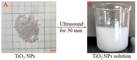 TiO2 NPs (A) and their solution after 30 min of ultrasonification (B). Scale bar: 0.5 cm.