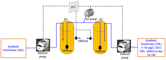 Two identical SBRs (R1 & R2) made of plexiglas with effective volumes of 3.6 L (H × D = 60 cm × 10 cm) were used in this work (Figure 2). R1 (the control) had no TiO2 NP addition, whereas TiO2 NPs were added to R2 at concentrations of 0–30 mg/L throughout the experiment. Two fine air pumps (PL60, RESUN, Chaozhou, China) were used to supply aeration to the bottom of the SBRs through air diffusers with a uniform airflow rate of 0.5 m3/h and a 50% volumetric exchange ratio. Each 240-min cycle consisted of the following steps: feeding for 5 min, aeration for 180 min, settling for 2 min, discharge for 5 min, and idle time for 48 min. All pumps and valves were controlled by programmable logic controllers (PLCs) in this experiment. The indoor temperature was maintained at 20 ± 5 °C using industrial-grade air conditioning (Haier, Qingdao, China), and the pH of wastewater was maintained at 7.0–7.5 using an appropriate amount of 10% HCl.