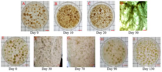 Figure 3 shows the morphological evolution of sludge in R1 and R2. Both SBRs were initially inoculated with lab-cultured AGS with a mean diameter of 3 mm, showing filamentous structures (Figure 3A,E). Filamentous bacteria grew quickly in R1 due to the easily biodegradable carbon resource NaAC, coinciding with an increase in AGS size (Figure 3B). Subsequently, excessive filamentous growth proliferated and extended outward from large AGS on day 20 (Figure 3C), and in the absence of effective action, the filamentous bacteria became dominant, leading to AGS disintegration on day 30 (Figure 3D). These results confirm that NaAC promotes filamentous bacterial growth [16,19]. Conversely, R2 was fed with synthetic wastewater containing 5–30 mg/L TiO2 NPs from day 21 to 100. While TiO2 NP concentrations of 5–20 mg/L showed limited effect on filamentous bacterial growth (Figure 3F,G), increasing the dosage to 30 mg/L on day 80 resulted in filamentous bacterial suppression and gradual AGS recovery on day 90 (Figure 3H). After NP supplementation was terminated on day 101, the extended filamentous bacteria were eliminated, and well-structured AGS re-emerged on day 130 (Figure 3I). This demonstrated that 30 mg/L TiO2 NPs effectively inhibited extended filamentous bacterial overgrowth, maintaining AGS stability. These experimental results clearly established that filamentous bacteria are sensitive to high dosages of TiO2 NPs [3,28].