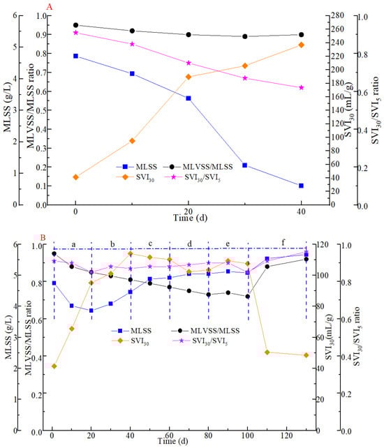 Correspondingly, MLSS and SVI were systematically monitored in both SBRs (Figure 4). In R1, the uncontrolled proliferation of extended filamentous bacteria (Figure 3A–D) was correlated with dramatic changes in MLSS and SVI30. MLSS declined from 4.72 to 0.61 g/L and SVI30 increased from 41.2 to 236.8 mL/g between day 0 and 40 (Figure 4A). Ultimately, a large amount of sludge was washed out from R1, leading to AGS collapse and indicating that R1 failed. This was well in agreement with previous studies [14,23]. In order to maintain operational stability, R2 was fed with artificial wastewater containing 5–30 mg/L TiO2 NPs from day 20 to 100 (Figure 4B). The initial 5 mg/L NP supplementation failed to prevent SVI30 elevation or MLSS reduction from day 0 to 40; specifically, SVI30 increased from 41.5 mL/g to 114 mL/g, and MLSS slowly decreased from 4.75 g/L to 4.46 g/L in stages a and b (Figure 4B). With increasing NP dosage, SVI30 presented a downward trend and MLSS showed an upward trend in stages c and d (Figure 4B). When the NP concentration reached 30 mg/L, the excessive proliferation of the extended filamentous bacteria was restrained, and AGS gradually recovered on day 90 (Figure 3H). After TiO2 NP addition was stopped, AGS with a compact structure and regular boundaries appeared again on day 130 (Figure 3I). In the end, both MLSS and SVI30 in R2 stabilized at 5.67 g/L and 48.5 mL/g (Figure 4B). Interestingly, the curve of the MLVSS/MLSS ratio showed a descending trend from day 0 to 100 and then an ascending trend from day 101 to 130 (Figure 4B). These findings demonstrated that low concentrations of NPs (<30 mg/L) were ineffective in suppressing filamentous bacteria, whereas higher concentrations (≥30 mg/L) successfully inhibited filamentous bacterial overgrowth. However, the increased NP dosage negatively impacted the MLVSS/MLSS ratio, likely due to the sedimentation of a portion of NPs in the sludge [3,26].