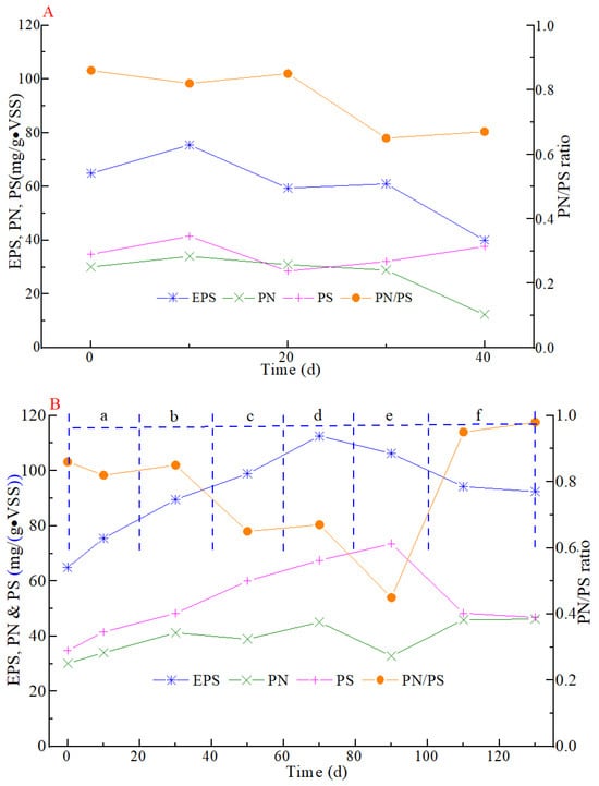 The EPS secreted by bacteria plays an important role in maintaining the AGS structure for stable reactor performance. The concentrations of EPS, PN, and PS were quantified throughout the experiment (Figure 5A,B). Generally, EPS, PN, and PS in R1 still decreased from 64.9, 30.1, and 34.8 mg/(g·VSS) to 40, 12.3, and 37.7 mg/(g·VSS) on day 40, respectively, and the PN/PS ratio decreased from 0.86 to 0.67 (Figure 5A), coinciding with filamentous bacterial overgrowth (Figure 3B–D), a quick increase in SVI30, and a rapid decrease in MLSS (Figure 4A). Finally, this imbalance accelerated sludge disintegration [19,37]. In contrast, when 5–30 mg/L TiO2 NPs were added to R2, EPS, PN, and PS all increased from 64.8, 30.2, and 34.6 to 106.3, 32.8, and 73.5 mg/(g·VSS) on day 90, respectively (Figure 5B). This was due to microbes producing more EPS to protect themselves from the toxic effects of TiO2 NPs [38]. After the extended filamentous bacteria were restrained (Figure 3H), NP addition was stopped on day 101. EPS gradually decreased and then stabilized at 92.4 mg/(g·VSS) on day 130. Meanwhile, the PN/PS ratio reached 0.98 (Figure 5B). PN provided a steric structure, and PS as a biogel facilitated AGS structural reintegration [3,38]. Subsequently, AGS with an integrated structure recovered well on day 130 (Figure 3I). The study revealed that NP dosage stimulated microbial EPS secretion as a protective response against TiO2 NP toxicity [38,39].