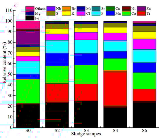 The elements of the sludge samples (S0, S2–S4, S6) from R2 were analyzed using XRF. As shown in Figure 5C, the seeding sludge (S0) contained the main elements of Fe (22.13%), Ca (22.7%), Zn (13.12%), Mn (4.83%), S (4.70%), Cl (4.61%), and Mg (1.95%). Notably, the proportion of Ti quickly increased from 0.83% (S0) to a peak of 33.39% (S4) following the addition of 5–30 mg/L TiO2 NPs between day 21 and 100 (Figure 3). This value finally decreased to 11.7% (S6) with the cessation of NP dosing between day 101 and 130 (Figure 5C). This confirmed that TiO2 NPs sedimented in the sludge [3], resulting in a lower MLVSS/MLSS ratio in stages b–e (Figure 4B). Concurrently, Fe, Ca, and Zn content declined from 22.13%, 22.7%, and 13.12% (S0) to 19.92%, 11.69%, and 0.27% (S4), and then rose to 24.74%, 15.31%, and 0.39% (S6), respectively. These elements contributed to aggregation and EPS production, facilitating AGS structural recovery [19]. This indicated that NPs reduced Fe, Ca, and Zn metal deposition in AGS. In summary, these findings demonstrated that TiO2 NPs induced significant Ti sedimentation while suppressing Fe, Ca, and Zn accumulation. High NP dosage altered metal sedimentation in the AGS system [3,30,40], highlighting the need for NP dosage optimization in practice.