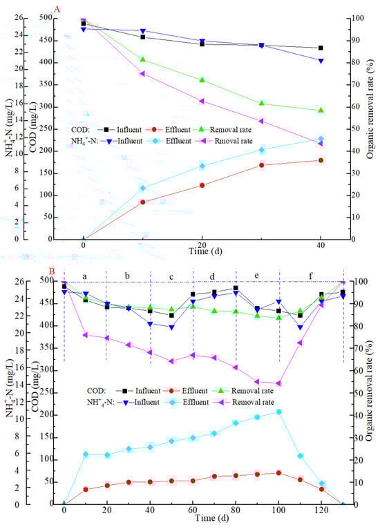 The performance of COD and NH4+-N degradation processes in both SBRs was systematically monitored throughout the experiment (Figure 6). Generally, the influent COD and NH4+-N in the two SBRs remained stable within the range of 420–490 mg/L and 21–25 mg/L, respectively. Effluent COD and NH4+-N showed similar changes from day 0 to day 20, but significant differences from day 21 to day 130 (Figure 6). Specifically, the effluent COD and NH4+-N in R1 increased rapidly from 0 mg/L to 180 and 11.9 mg/L on day 40 (Figure 6A). Correspondingly, the removal rates of COD and NH4+-N also quickly decreased from 100% to 58.5% and from 100% to 43.6% because the uncontrolled filamentous bacteria grew excessively in R1 (Figure 3A–D), resulting in impaired sludge settling performance. Subsequently, a large amount of biomass with high SVI30 was washed out, and MLSS greatly reduced in R1 (Figure 4A). These findings indicate that extended filamentous bacteria have negative impacts on sludge properties and organic degradation [16,17,19].