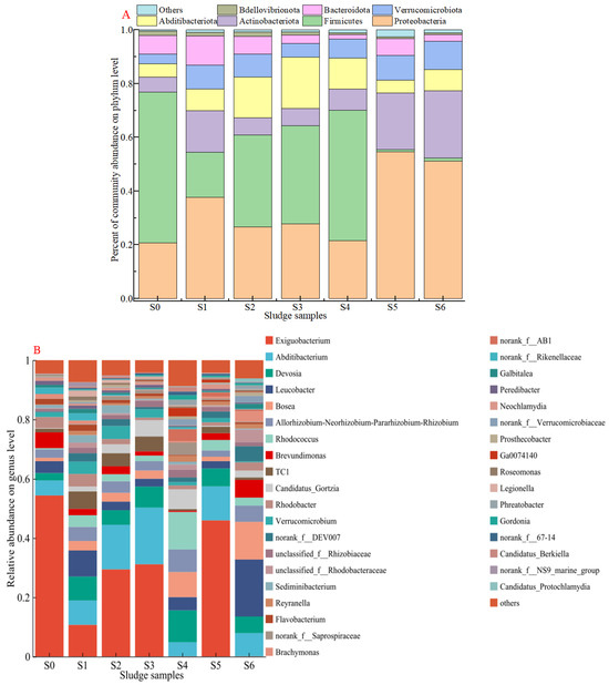 Microbial community in all sludge samples (S0–S6) at the phylum (A) and genus levels (B).