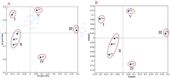 Beta diversity analysis was also carried out using both PCoA and NMDS based on unweighted unifrac distance (Figure 8A,B). As shown in Figure 8A, the PCoA results revealed significant microbial community differences, with principal components PC1 and PC2 explaining 45.73% and 18.39% of the total variance, respectively. Notably, the inoculated sludge (S0) displayed a remarkable gap compared with the other samples (S1–S6). While sludge was exposed to 5–20 mg/L TiO2 NPs, the S1–S3 samples clustered relatively close together. When the NP dosage increased to 30 mg/L, S4 exhibited marked divergence. Interestingly, even after NP addition ceased on day 101, the S5 and S6 samples still remained significantly distinct (Figure 8A). Correspondingly, the NMDS analysis (Figure 8B) yielded patterns consistent with the PCoA results (Figure 8A). The seeding sludge S0 exhibited significant separation from the subsequent samples, reflecting distinct microbial community structures shaped by extended filamentous bacterial proliferation (S2) and TiO2 NP addition (S3, S4). Even after NP cessation on day 101, the S4 and S5 samples demonstrated persistent divergence. This suggested that TiO2 NP exposure induced irreversible alterations in bacterial community structure [42]. Consequently, the S0–S6 samples were divided into five distinct clusters I (S0), II (S1–S3), III (S4), IV (S5), and V (S6)—according to the PCoA and NMDS results (Figure 8).