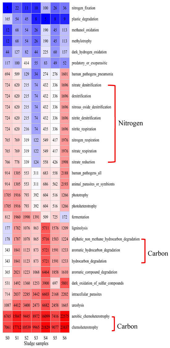 Figure 9 presents the heatmap analysis of functional metabolisms related to carbon and nitrogen degradation pathways. The ranges of hydrocarbon degradation functional groups involving aliphatic non-methane, aromatic, and other hydrocarbons increased from 173–343 (S0) to a peak value of 5716–5721 (S4) as TiO2 NP concentration rose from 0 to 30 mg/L during days 21–100. However, the values decreased and stabilized at 1233–1234 (S6) after NP cessation. Notably, other hydrocarbon degradation functional groups related to aerobic chemoheterotrophy and general chemoheterotrophy showed consistent increases throughout the experiment (S0–S6). In contrast, nitrite reduction functional groups (nitrate/nitrite/nitrous oxide denitrification, nitrate/nitrite/nitrous respiration, and nitrate) initially declined from 724–766 (S0) to 74–124 (S3), and then rose to the range of 1696–1988 (S6). These findings revealed that TiO2 NPs exerted more pronounced inhibitory effects on NH4+-N removal than on COD removal [3,24,41]. These metabolic patterns were corroborated by the COD and NH4+-N degradation profiles shown in Figure 6B.