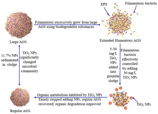Proposed model of extended filamentous bacteria controlled by adding TiO2 NPs to the AGS system.