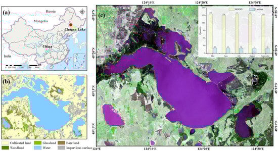 As the seventh-largest freshwater lake in China, Chagan Lake is also the largest natural lake in Jilin Province. The geographical location of Chagan Lake is 124°03′ E–124°34′ E, 45°09′ N–45°30′ N. It is located in Qian Gorlos Mongolian Autonomous County in the northwest of Jilin Province, China. The surface of Chagan Lake is long and narrow, extending from southeast to northwest (Figure 1). The Chagan Lake region features a semi-arid temperate continental monsoon climate, marked by cold winters, hot summers, and mild spring and autumn seasons. The lake area covers 345 km2, with a water storage capacity of 700 million m3 and an average water depth of 2.5 m [41]. Precipitation in Chagan Lake is mainly concentrated from July to September, with an average annual precipitation of 415.4 mm, an evaporation of 964 mm, an average temperature of 4.5 °C, and a wind speed of 3.9 m/s [42,43].