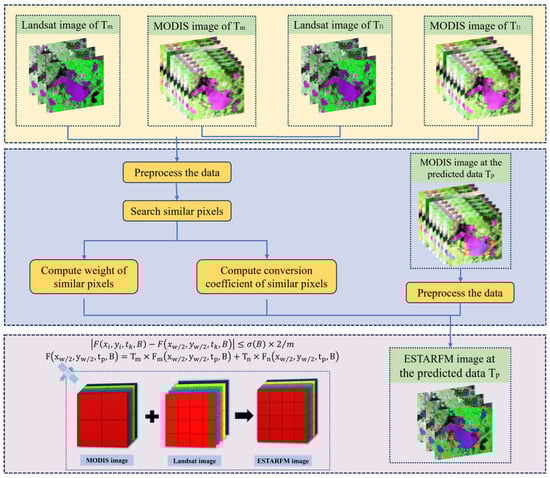 The main idea of ESTARFM is to obtain the reflectance of the predicted data based on the spectral, temporal, and spatial information of the input images [19], It aims to leverage the correlation between multiple data sources for data fusion while minimizing systematic bias. The ESTARFM algorithm consists of four main steps: selecting similar neighboring pixels, calculating the weights of these pixels, determining the conversion coefficient, and estimating the reflectance of the center pixel [51,52].
