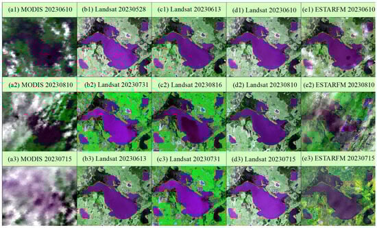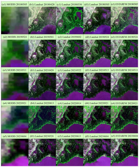 Fusion results of ESTARFM: (a) original MODIS image of the predicted data: (b) and (c) are input datasets from Landsat-8 image; (d) Landsat-9 image of the predicted data, and (e) image of the fusion of the ESTARFM. Among them, purple represents water.