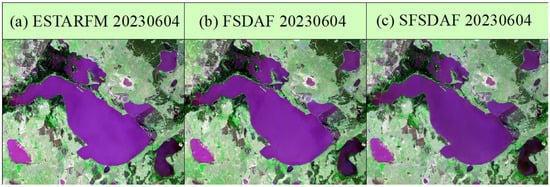 A comparison of the fusion results from the ESTARFM, FSDAF, and SFSDAF models: (a) ESTARFM; (b) FSDAF model; (c) SFSDAF model. Among them, purple represents water.