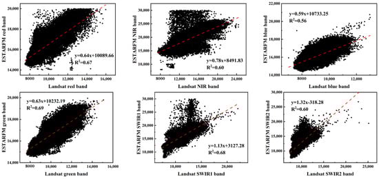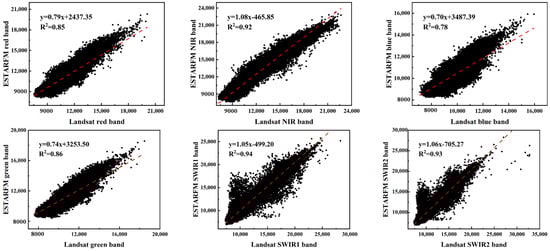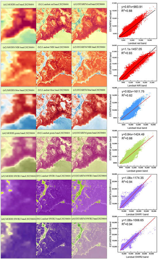 To achieve more accurate results, this study selected images from June 4 as typical phases for the detailed analysis of six bands, primarily because they are representative: this date falls in the middle of the Landsat image acquisition cycle (with an 8-day interval between images), thereby fully meeting the ESTARFM’s optimal requirements for temporal consistency. While analyses of other dates also demonstrated high correlation (with R2 values remaining above 0.80), images taken in early June had two significant advantages: first, vegetation was in a stable growth period at this time, with typical ground cover characteristics; second, atmospheric conditions were generally favorable during this period, thereby ensuring image quality. Selecting images from that day ensures both the reliability and representativeness of the analysis results. Figure 5 shows the correlation analysis between the real data and the ESTARFM fusion image for each band, with the coefficients of determination being 0.88, 0.93, 0.82, 0.88, 0.94, 0.94, indicating a high degree of correlation. These results demonstrate that the ESTARFM has achieved satisfactory performance for each band.