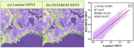Scatter plot between (a) NDVI values of clear-sky Landsat imagery; (b) NDVI values after fusion of ESTARFM (c). Among them, purple represents water.