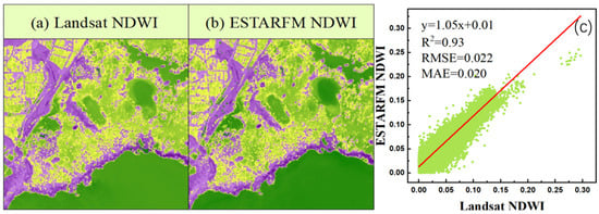 Scatter plot between (a) NDWI values of clear-sky Landsat imagery; (b) NDWI values after fusion of ESTARFM (c). Among them, green represents water.