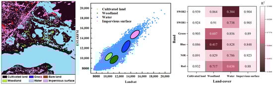 Figure 8 presents the different land-cover types in the specified area of Chagan Lake on the left, the accuracy analysis of farmland, forest land, water bodies, and impervious surfaces in the middle, and the R2 values of each band for farmland, forest land, water bodies, and impervious surfaces on the right. The results indicate that most of the fused images from the ESTARFM across different bands are highly positively correlated with the actual Landsat images. However, the blue band for forest land and the SWIR2 band for water exhibit lower coefficients of determination. This may be attributed to multiple scattering by the vegetation canopy, which causes nonlinear reflection in the blue band, and to the strong absorption characteristics of water bodies in the SWIR2 band, which reduce the signal-to-noise ratio. This limitation restricts the application of fusion data in fields such as mineral identification, which require accurate SWIR2 information. Overall, the ESTARFM can effectively enhance the spatiotemporal availability of raw data. By generating high-spatiotemporal-resolution fusion images, it provides a more complete and continuous data foundation for land-use classification research, thereby significantly improving classification accuracy.