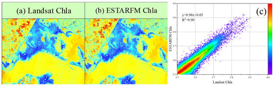 Comparison analysis diagrams: (a) Chla values from clear-sky Landsat images; (b) Chla values after ESTARFM fusion; (c) accuracy verification diagram.