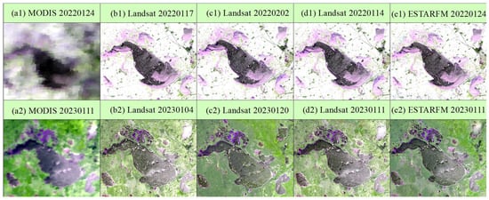 Lake ice is a crucial component of the cryosphere and serves as a highly sensitive indicator of climate change [67,68]. Lake-ice phenology monitoring in cold regions is crucial for understanding climate change, protecting the ecosystem, managing water resources, and predicting natural disasters [69,70,71]. However, in lake-ice phenology monitoring research, the insufficient spatiotemporal resolution of a single remote sensing data source often leads to decreased accuracy in lake-ice extraction and the misjudgment of phenological characteristics. High-spatiotemporal-resolution images generated through ESTARFM fusion can clearly present the spectral and texture characteristics of the ice–water boundary, thereby significantly improving the accuracy of visual interpretation of winter ice conditions and effectively reducing monitoring errors caused by data loss (Figure 13).
