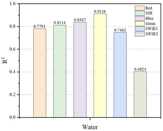 To assess the accuracy of the ESTARFM across different land-use types, we assessed four land-use types in the fusion results for the selected region, including cropland, forested land, water, and impervious surfaces. Figure 8 shows the fusion accuracy of the four land-use types in the selected area and the cross-band fusion accuracy evaluation results of ESTARFM.
