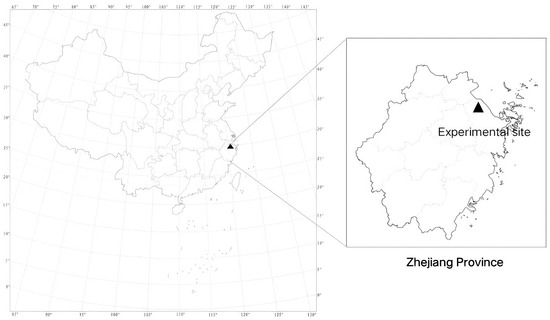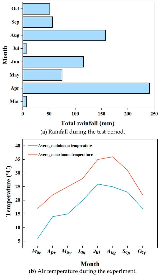 The field trial was conducted over an 8-month period (March–October 2024). The trial was performed in the planting area of Cixi Hangzhou Bay Ningbo Haihan Agricultural Development Co., Ltd., located at a geographical coordinate of 30°10′ N latitude and 121°13′ E longitude (Figure 1). Located within the subtropical zone, the region displays four distinct seasons. According to climate data from the past decade, the area receives 1422 mm of rainfall and accumulates 1850 h of sunlight annually. The salinity level of the alkaline soil in the study area ranges from a minimum of 10 g/kg to a maximum of 280 g/kg. Before the experiment, the soil underwent appropriate improvement measures, including leaching irrigation, plant cultivation, and application of organic fertilizers. The precipitation during the experimental period is shown in Figure 2a, and temperature data are depicted in Figure 2b.