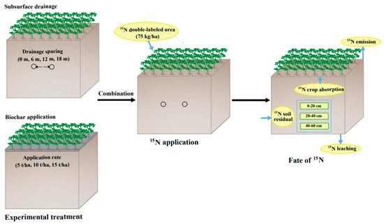 In previous studies, 15N isotope labeling and tracing techniques have often been used to distinguish between nitrogen fertilizer and soil nitrogen [18], especially in research on nitrogen fertilizer utilization efficiency and its behavior. Utilizing 15N isotope labeling and tracing techniques is beneficial for better understanding the behavior of fertilizer nitrogen. In the present study, we used 15N-labeled urea as a source of fertilizer, with salt-tolerant alfalfa suitable for planting in coastal saline–alkali land as the plant material. Different spacings of subsurface drainage and varying amounts of biochar were designed to observe the movement and distribution of fertilizer nitrogen (15N) and to statistically analyze the seasonal crop utilization efficiency of 15N under different treatments. This work focused on (1) quantifying the differences in alfalfa 15N utilization efficiency under different spacings of subsurface drainage and the combined application of biochar, (2) clarifying the movement and balance of 15N under different treatments, and (3) identifying combinations that maximize 15N use efficiency while minimizing N losses.