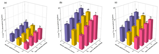 With decreased drainage-pipe spacing from S3 to S1, the 15N absorption of the third cut of alfalfa significantly (p < 0.05) increased, but when it decreased from S2 to S1, this difference was significant (p < 0.05) only at the C3 biochar application level. Compared with drainage pipes, the effect of biochar application on 15N absorption by alfalfa was relatively small, which was similar to the results observed in the second cut. In most cases, increasing the amount from C1 to C2 or from C2 to C3 did not result in a significant increase in 15N absorption by alfalfa, with a significant increase (p < 0.05) occurring only with increased biochar application from C1 to C3. The drainage pipes also promoted 15N absorption in the third cut of alfalfa, with absorption amounts of 11.9, 10.8, and 8.9 kg/ha under S1, S2, and S3, respectively, all found to be higher than those under CK (6.8 kg/ha).