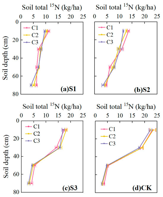 Impact of different drainpipe spacings and biochar application rates on the distribution of 15N in the profile soil. (CK, S1, S2, and S3 represent drainpipe spacings of 0 m (no drainpipe), 6 m, 12 m, and 18 m, respectively; C1, C2, and C3 represent biochar application rates of 5, 10, and 15 t/ha, respectively.