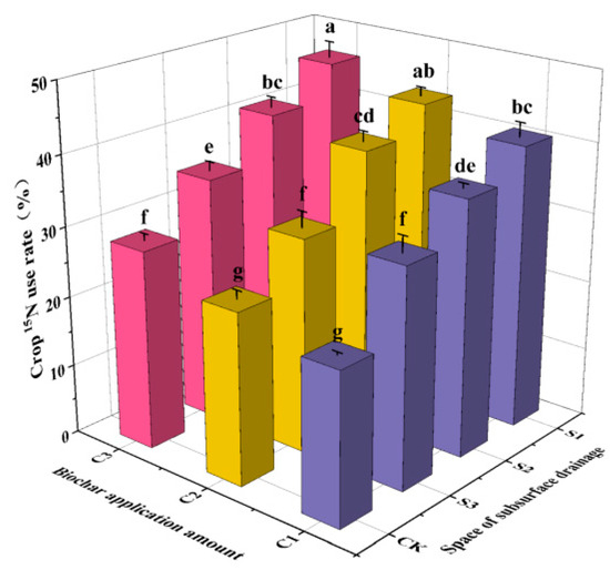 Under different drainpipe spacings and biochar application rates, 21.6% to 46.0% of the exogenous 15N applied was absorbed by the crop, 38.6% to 67.5% remained in the soil, and 8.5% to 18.1% was lost through leaching, gaseous losses, or other unknown losses (Figure 8). A good treatment was considered one that can increase the crop’s 15N absorption ratio while decreasing the 15N soil residue and loss ratios. However, according to the results of this study, no treatment exhibited all these beneficial effects simultaneously.