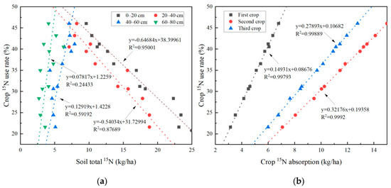 Relationship between crop 15N use rate and residual 15N in different soil layers (a) and 15N uptake by three harvests of alfalfa (b).