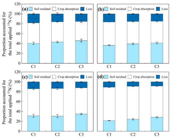 Our experiments revealed that the 15N residual proportion at 40–60 and 60–80 cm depths in the S1 treatment (accounting for the total 15N in the 0–80 cm soil layer) was significantly higher than those in the other two subsurface drainage treatments. The reason may be that under this spacing, water infiltration was smoother, but it can also increase the risk of 15N leaching. The higher total 15N loss in the S1 spacing (Figure 7) supported this hypothesis. Overall, the 15N residual in the 60–80 cm soil layer was relatively low, so we inferred that the total loss of 15N was primarily from gaseous losses, with less leaching to soil layers below 80 cm. We further speculated that the slight reduction in 15N loss after biochar application may be due to its control over volatilization losses.