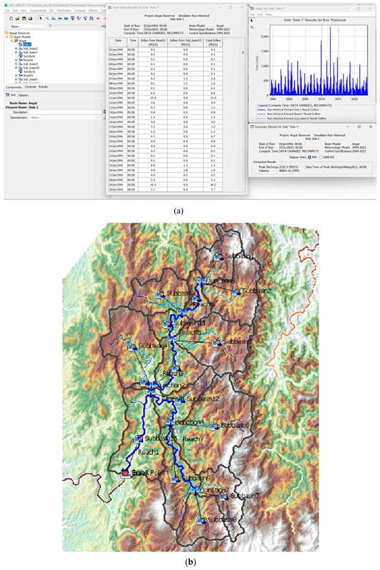 Model calibration was performed through an iterative process to enhance agreement between simulated outputs and expected seasonal runoff behaviors in the Angat watershed. Given the absence of continuous observed streamflow data for the dam outlet, calibration relied on secondary references describing historical hydrological trends in the region, particularly the timing and magnitude of flows during dry and wet seasons. Key parameters—such as the SCS Curve Number, baseflow recession constants, and storage coefficients—were systematically adjusted to reproduce these seasonal patterns. The calibration was evaluated through visual comparison of hydrographs and discharge volumes, focusing on the occurrence of peak flows and baseflows. Although quantitative calibration metrics such as the Nash–Sutcliffe Efficiency (NSE) and Root Mean Square Error (RMSE) were not calculated due to data constraints, the model was considered reliable for scenario comparison, as it reflected the watershed’s known hydrologic behavior under varying rainfall conditions. This limitation is acknowledged in the Conclusions Section. As shown in Figure 3b, the lower panel illustrates the Angat basin model constructed in HEC-HMS, featuring delineated sub-basins, reaches, and junctions connected to the main outlet. The upper panels Figure 3a display a sample simulation output from the historical rainfall scenario (1994–2023), including the tabular hydrograph for daily outflows and the graphical discharge time series for the “Sink-1” outlet. These results capture the distinct peak flows typically observed during the wet season and validate the model’s ability to simulate long-term runoff behavior.