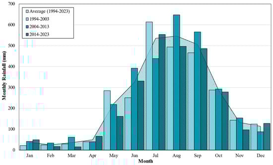 Average monthly rainfall data for the Angat watershed from 1994–2023.