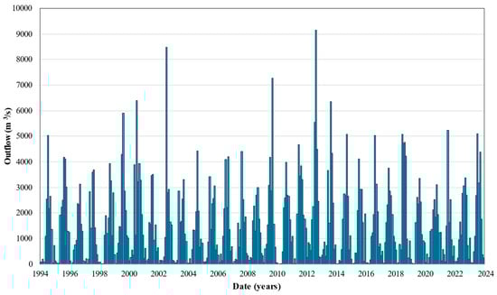 The seasonal relationship between rainfall and outflows is further illustrated in the historical hydrograph (Figure 5), which shows distinct peaks corresponding to wet-season rainfall maxima. The highest recorded outflow occurred in August 2012, at 2332.4 m3/s, attributed to intense tropical storm activity during that month. Over the 30-year period, the total outflow was 86,861.62 mm, while periods of low outflow were frequently observed during the dry season, reflecting minimal rainfall and baseflow contributions.