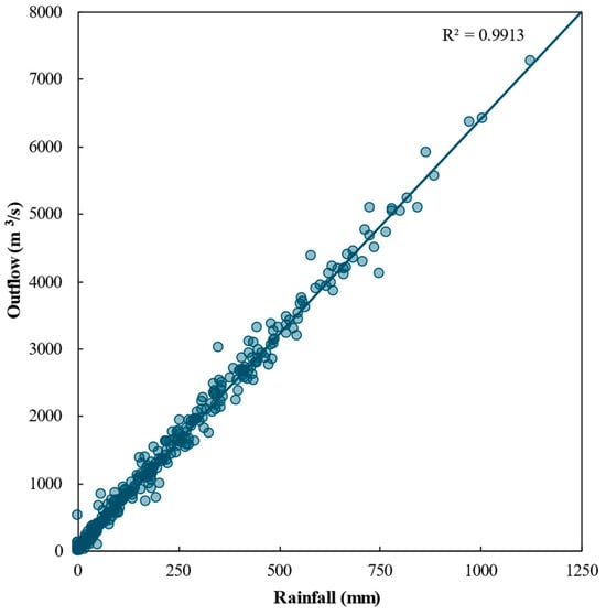 The relationship between rainfall and outflow was further examined through a scatter plot (Figure 6), revealing a strong positive correlation (r = 0.89) and coefficient of determination of 0.99. This indicates that rainfall is the dominant factor driving hydrological responses in the Angat watershed. Months with lower rainfall cluster in the lower-left corner of the plot, while wet-season months (July–September) form the upper-right cluster. The relatively linear alignment of points suggests a direct runoff response to rainfall. Deviations from this trend may reflect influences such as reservoir operations or catchment infiltration characteristics. This suggests that the hydrological response of the watershed is primarily driven by surface runoff rather than baseflow contributions from groundwater.
