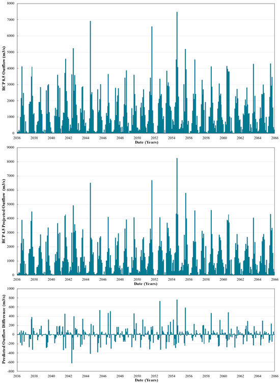 The simulated hydrographs for the projected period (2036–2065), as shown in Figure 7, reflect noticeable shifts in the Angat watershed’s hydrological behavior under climate change conditions. The 30-year total outflows, summarized in Table 4, indicate significant variation in projected discharge levels under both RCP 8.5 and RCP 4.5 scenarios, with important implications for future water resource management.