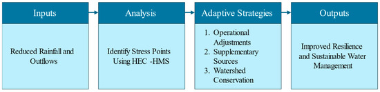 To mitigate these risks, adaptive reservoir management strategies must be prioritized to ensure the sustainable use of water resources. Figure 8 presents a sample workflow of adaptive reservoir management strategies for the Angat watershed. Climate projections and hydrological modeling results, such as those from this study, can serve as key inputs for optimizing reservoir operations. For instance, during wet-season months, when inflows are highest, water storage must be maximized to secure reserves for drier periods. Similarly, controlled releases during the dry season can help manage supply without exacerbating shortages.