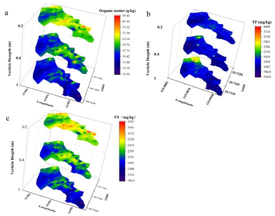 Spatial distribution of nutrient elements: (a) organic matter, (b) TN, and (c) TP.