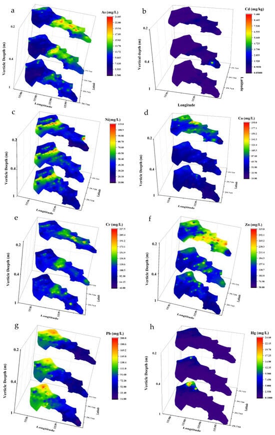 Figure 3a delineates the vertical stratification of arsenic concentrations, revealing a progressive decline in mean values from surface (11.70 mg·kg−1) to intermediate (10.44 mg·kg−1) and deep layers (9.16 mg·kg−1), with spatially persistent contamination footprints across sedimentary horizons.