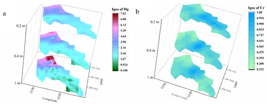 The content distribution of mercury in the three-layer sediments of the lake is shown in Figure 3h. In the surface sediments, the mercury content at each point varies little, all below 3 mg·kg−1, but exceeds the background value.