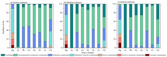 The pollution of Hg is the most serious. In the surface sediment, the evaluation level of most points reaches moderately to heavily contaminated, and a small number of points reach an extremely contaminated level. The number of points with a pollution level above severe has little difference among the three-layer sediments. With the increase in depth, the number of points evaluated as moderately to heavily contaminated gradually decreases, and the number of points evaluated as uncontaminated to moderately contaminated gradually increases.