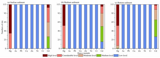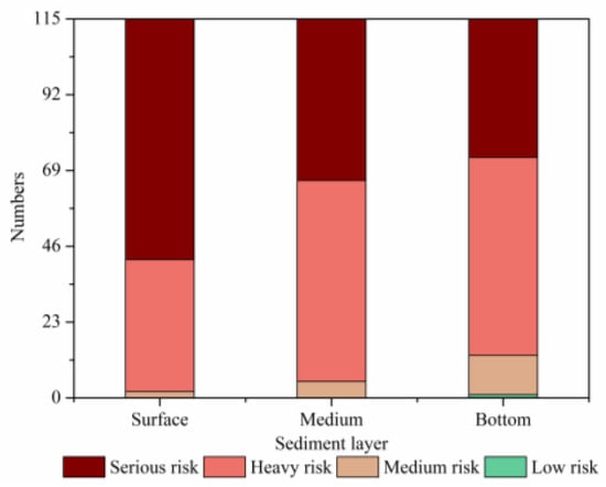 The potential ecological risk assessment method was used to evaluate the potential risk levels reached by the eight elements’ contents in the three-layer sediments at 115 sampling points. The number of sampling points reaching each level is shown in Figure 6. The Eri values and RI values calculated by the PERI are shown in Table S3.