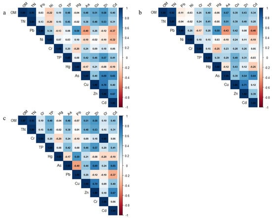 Correlation analysis of (a) surface sediment, (b) medium-layer sediment, and (c) bottom-layer sediment between different elements.