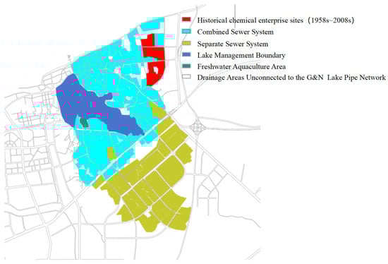 The drainage zones in the central urban area before the implementation of storm-sanitary sewer separation retrofits (pre-2021) are shown in the Figure 9 below. Due to crude local drainage management practices, wastewater from areas with separated sewer systems inevitably entered the wastewater treatment plant via combined sewer pipelines. For an extended historical period, phosphate fertilizer plants and other chemical enterprises were located around this lake [11].