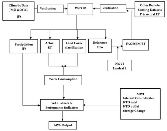 The study methodology was based on the collection and integration of climatic data, remote sensing data and ground surveys. Climatic data and remote sensing sources other than WaPOR were used to assess WaPOR-derived precipitation and actual ET. Reference ET (ET0) from WaPOR, along with NDVI layers from Landsat 8, were used to derive FAO-56 Penman-Monteith ET, which was then compared with WaPOR’s actual ET. Water use categories were obtained from a detailed land cover map available through the WaPOR portal. Data on groundwater supply to farmers, inflow to KTD, and outflow from the basin were obtained from the MWI. These, along with WaPOR AETI and precipitation data, were input into WA+ sheets to generate the information needed to assess irrigation water supply in AZB and evaluate AWA output. A summary of the methodology is presented in Figure 1.