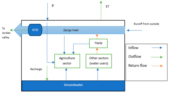 The study was carried out in the Amman–Zarqa basin (AZB), which is located in the north of Jordan and covers about 3600 km2 (Figure 2). The basin is significant in terms of its socioeconomic conditions and agricultural activities, as it hosts more than 50% of Jordan’s population [22], 80% of its industry, and 25% of the irrigated area in Jordan [11]. Additionally, the AZB provides water for irrigation in the greater Jordan Valley [22]. The basin includes the northern areas of Amman and Zarqa, in addition to Jerash and the eastern areas of the Balqa Governorate. The mean annual precipitation ranges from 50 mm in the east to more than 500 mm in the northwest near Ajloun and the southwest of Amman. These variations, primarily due to topographic influences, result in an estimated long-term average annual precipitation volume of 782 million cubic meters (MCM) [10]. The climatic conditions in the eastern and southeastern parts of the Basin are classified as arid, with mean annual temperatures oscillating between 7.4 and 24.5 °C. Conversely, the western regions exhibit typical Mediterranean climates, categorized as semiarid in Amman and dry sub-humid in Ajloun, where precipitation levels surpass 560 mm. The western areas are predominantly mountainous, exhibiting cool temperatures during the winter season and mild temperatures in the summer months. Water resources within the basin encompass groundwater aquifers, surface water derived from the Zarqa River, and treated wastewater (TWW); the inflow and outflow are presented in Figure 3.