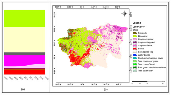Land cover map of AZB demonstrating its temporal variation during 2014–2022 (a) and spatial variation in 2022 (b).
