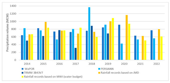The precipitation data was used to derive the rainfall inflow required to fill the resource base sheet of WA+. Water inflows to the basin consisted of precipitation and surface runoff. Domestic water supply came from both internal groundwater aquifers and inter-basin transfers, while other sectors (industry, livestock, and tourism) relied on internal groundwater. The volume of precipitation inflow was calculated from recorded rainfall and remote sensing data (Table 1). This included WaPOR precipitation, representing the Climate Hazards Group InfraRed Precipitation with Station (CHIRPS) quasi-global rainfall dataset, along with other remote sensing products, such as the Tropical Rainfall Measurement Mission (TRMM) [24,25] and the Precipitation Estimation from Remotely Sensed Information using Artificial Neural Networks (PERSIANN) [25,26], which provide free global precipitation data with varying spatial and temporal resolutions.
