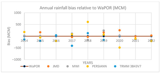 Volumes of water inflows to AZB from rainfall based on WaPOR data ranged from 593 to 912 MCM, while calculated rainfall volumes from rain stations ranged from 622 to 1165 MCM. The precipitation volume from other remote sensing sources is shown in Figure 5, in addition to data from water budget and station records. Daily station records were aggregated to yearly values multiplied by the area around each station and compared with the corresponding WaPOR data. Annual rainfall biases relative to WaPOR are shown in Figure 6. The results indicate that JMD generally reported slightly higher rainfall than WaPOR, particularly during wetter years such as 2015 and 2020, suggesting a modest underestimation by WaPOR during high-intensity events. PERSIANN exhibited the highest interannual variability, with notable overestimations in 2018 and significant underestimations in 2020. TRMM consistently underestimated rainfall compared to WaPOR, while MWI estimates were more closely aligned, though still showed some interannual fluctuations. Statistical evaluation further supported these observations.