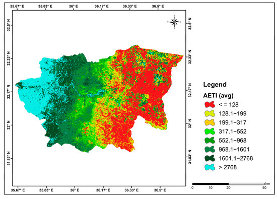 Table 9 summarizes the PI of the ET sheet for the AZ basin. The T, agricultural ET, and irrigated ET fractions averaged 56.3, 36.7, and 7.0%, respectively. The results show that there was a small proportion of irrigated areas in the basin. Al-Bakri et al. [13] reported that over 80% of ET was beneficially used in the Northern Jordan Valley, suggesting efficient water use under deficit irrigation practices, compared to 59% in the AZB.